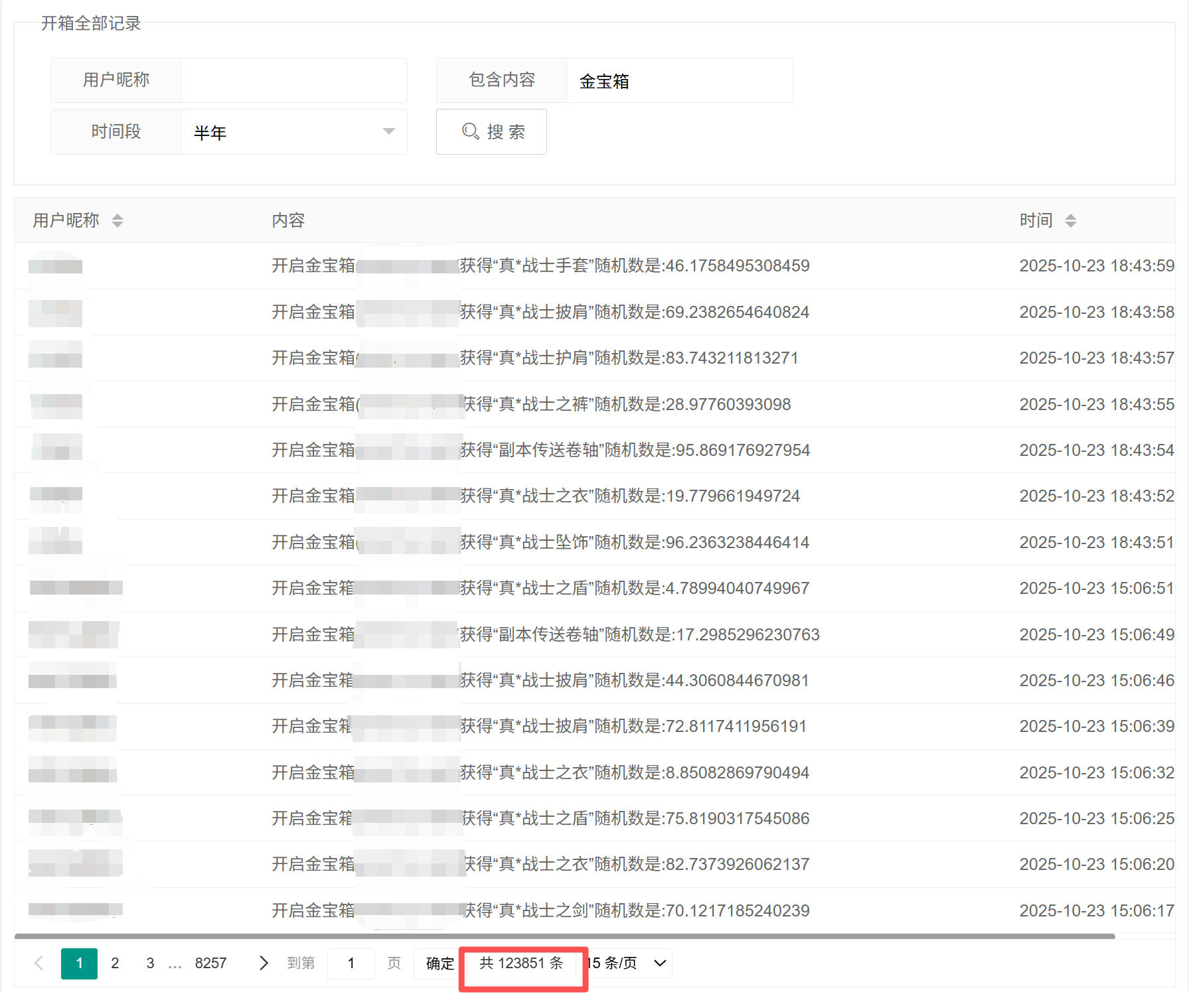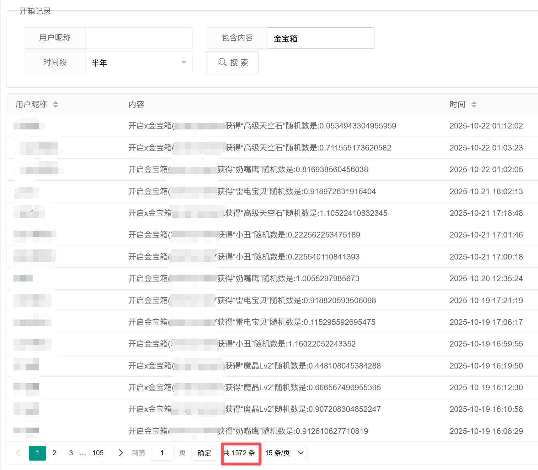 1572/123851=0.01269, 金宝箱半年大概就是1.27%的几率开出。