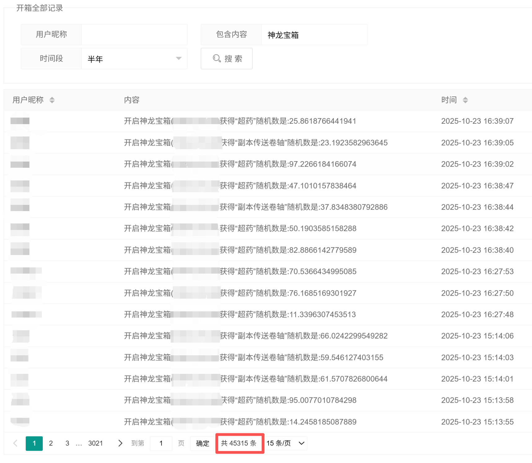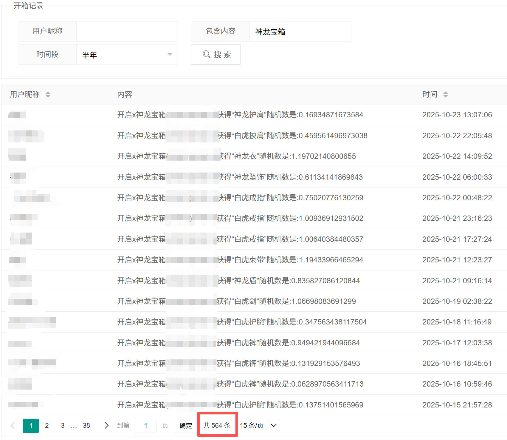 564/45315=0.012446,神龙宝箱半年时间大概就是1.24%的几率开出。